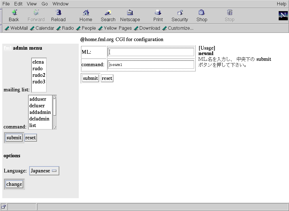 左の画面のコマンドで newml を選択し、 submit ボタンを押して下さい。 ML 名を選択する必要はありません:)